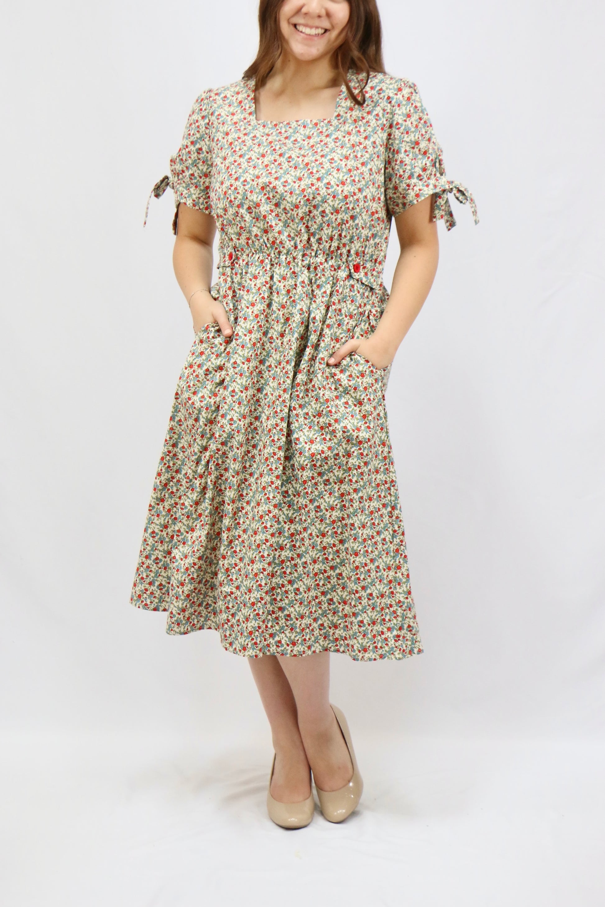 The Anna Dress brings a playful charm with its ditsy floral print and flattering square neckline. Crafted from soft cotton, it features tie details on the sleeves and a button accents at the waist for a touch of whimsy. Side pockets add practicality, while the lined A-line skirt ensures comfortable movement and a flattering silhouette. Perfect for sunny days and casual outings, this dress combines sweet style with everyday ease.