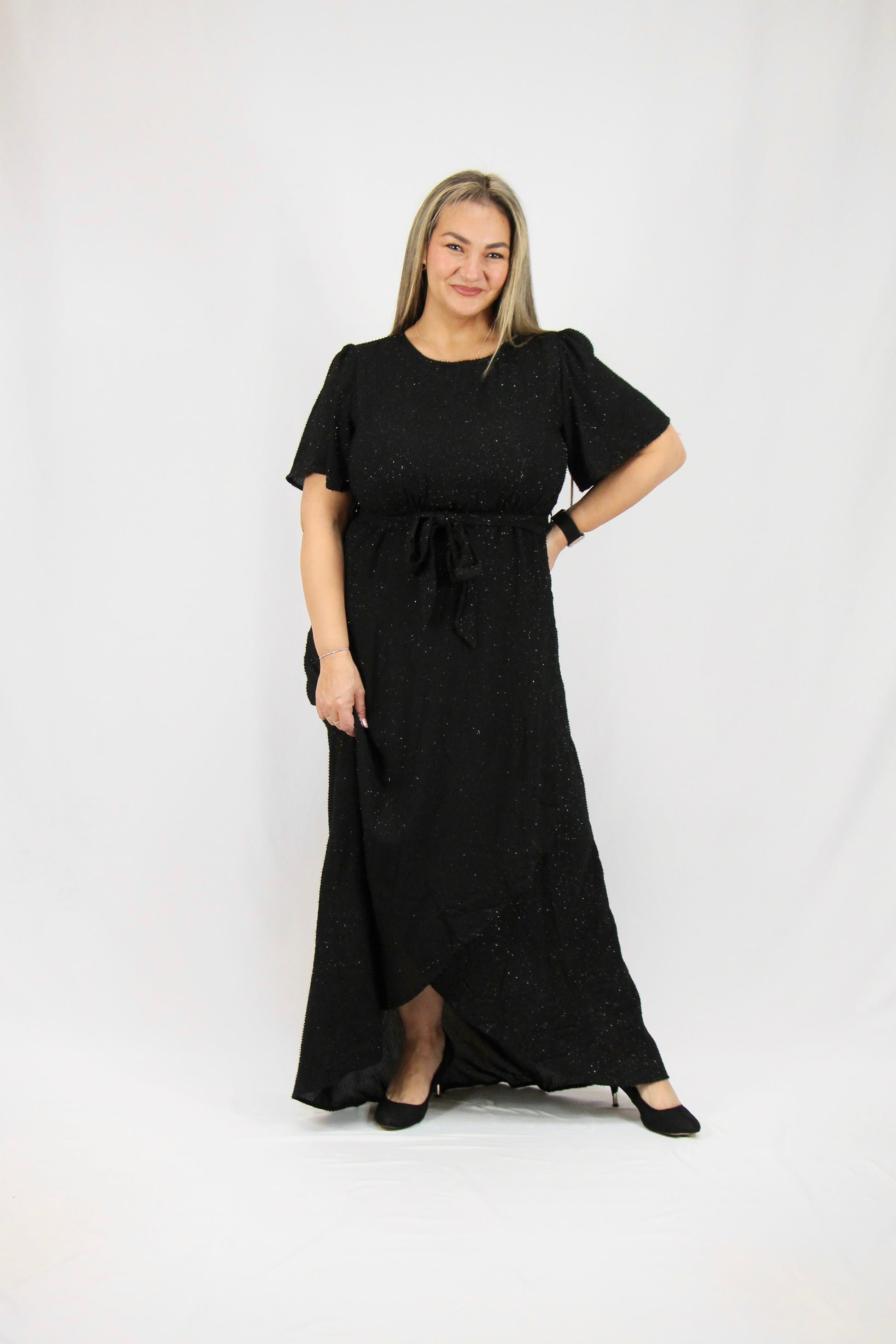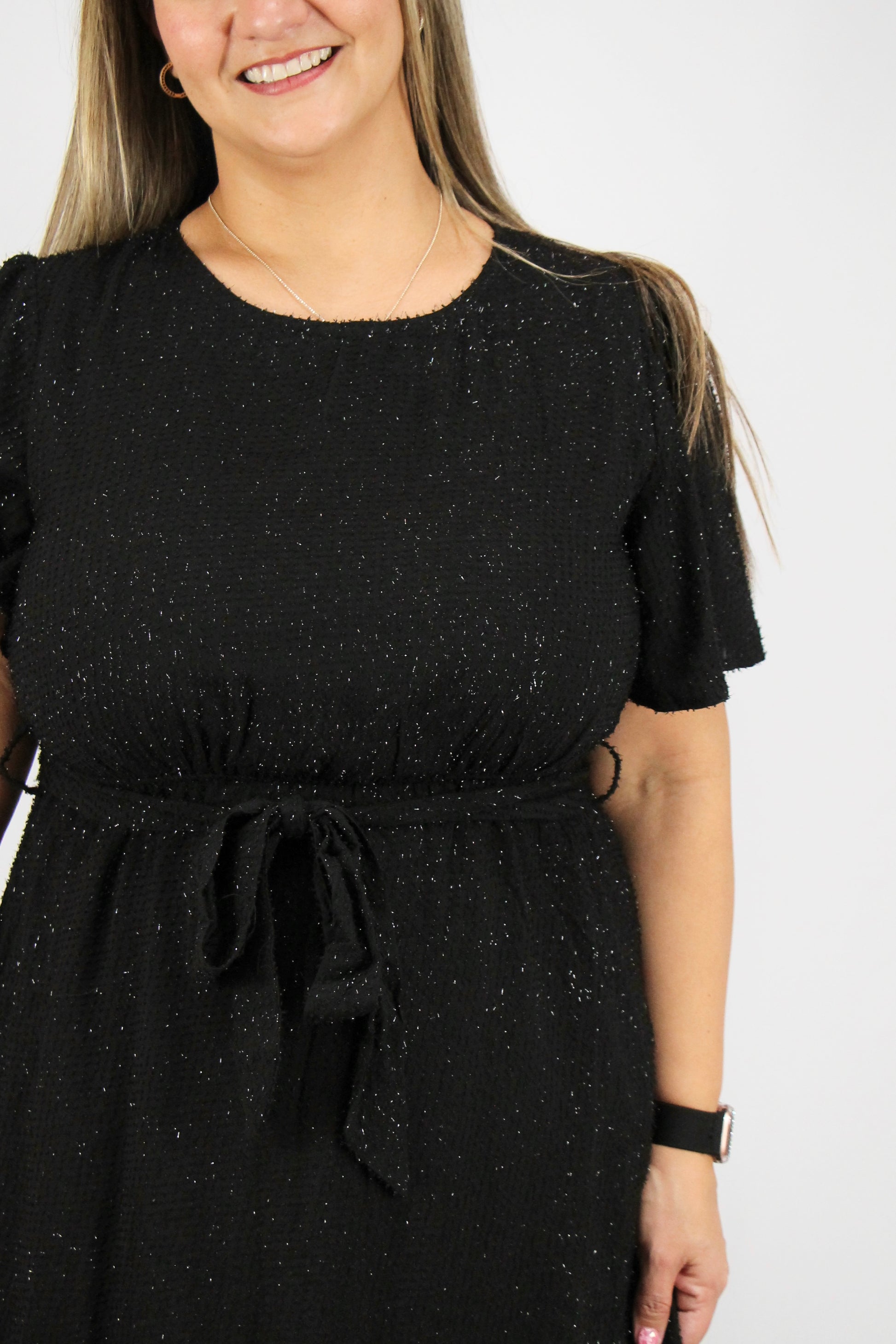 The Aster Dress combines elegance with eye-catching allure. This sophisticated black dress features a shimmering sparkle finish that catches the light beautifully, while the high-low hemline adds dynamic movement and modern flair. Short cape sleeves provide a graceful, refined silhouette, and the self-tie belt allows you to customize the fit and create a polished waistline. Perfect for evening events, cocktail parties, or any occasion where you want to make a memorable impression.