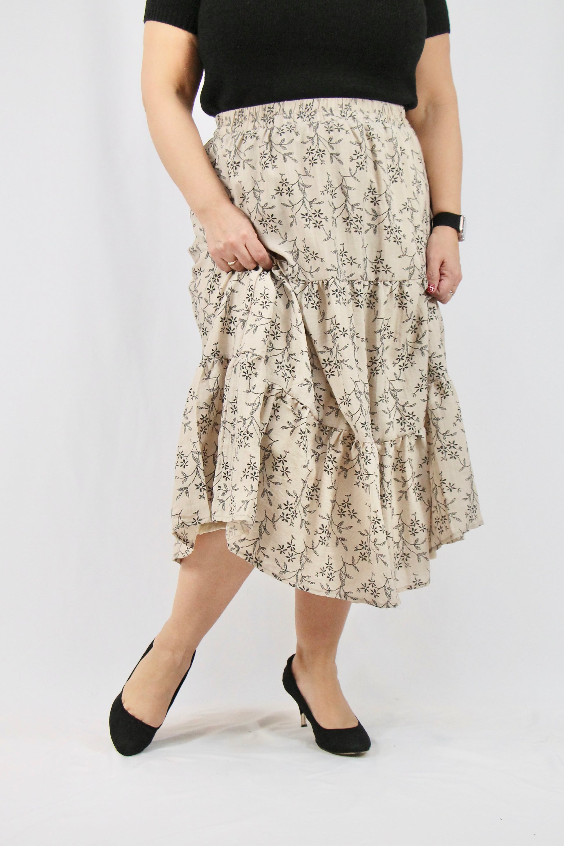 The Audrey Skirt is your ticket to effortless style! Crafted in soft light beige with playful black botanical prints, this tiered midi skirt brings movement and personality to any outfit. Dress it up or down—this versatile piece is ready for whatever adventure comes your way.