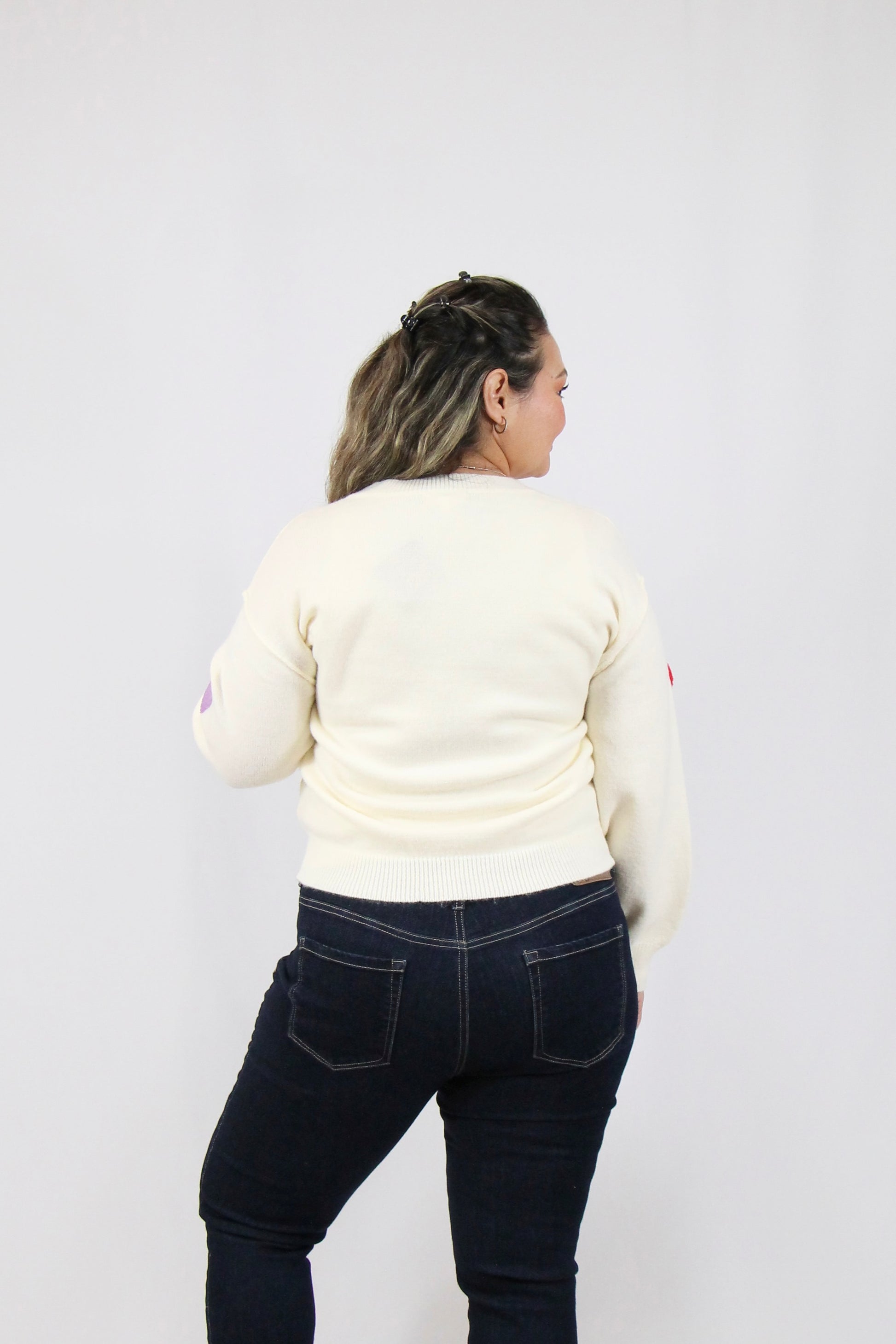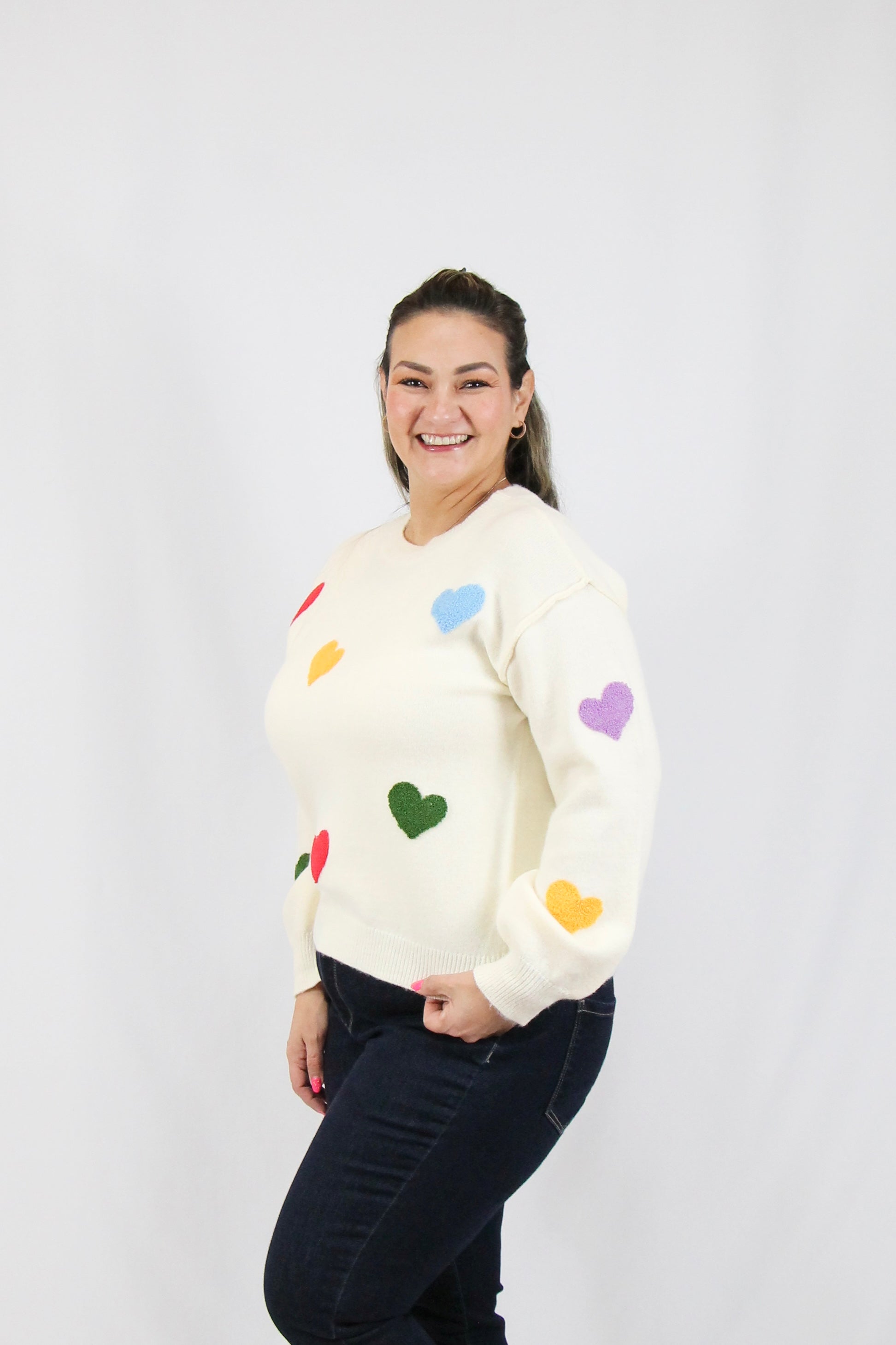 Spread the love with this charming pullover sweater featuring a playful mix of colorful hearts scattered across the sweater. Perfect for expressing your sweet side, whether you're celebrating Valentine's Day or just embracing feel-good vibes year-round. The cozy knit fabric keeps you warm and comfortable, while the fun heart design adds instant personality to any casual outfit. A delightful wardrobe staple that brings joy to your everyday style.