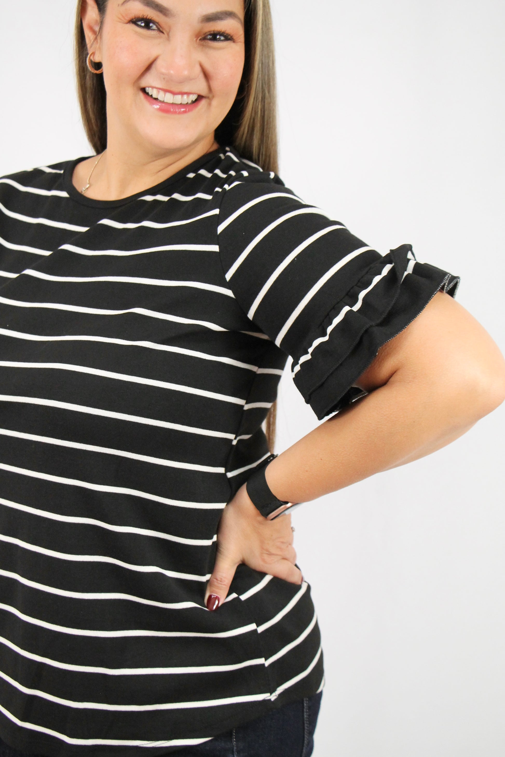 The Callie Top adds a fun twist to your casual wardrobe with its black and white stripes and charming ruffle sleeves. Easy to dress up or down, this shirt brings a playful vibe to any day while keeping you comfy and stylish. Perfect for those who love a little flair in their everyday look.