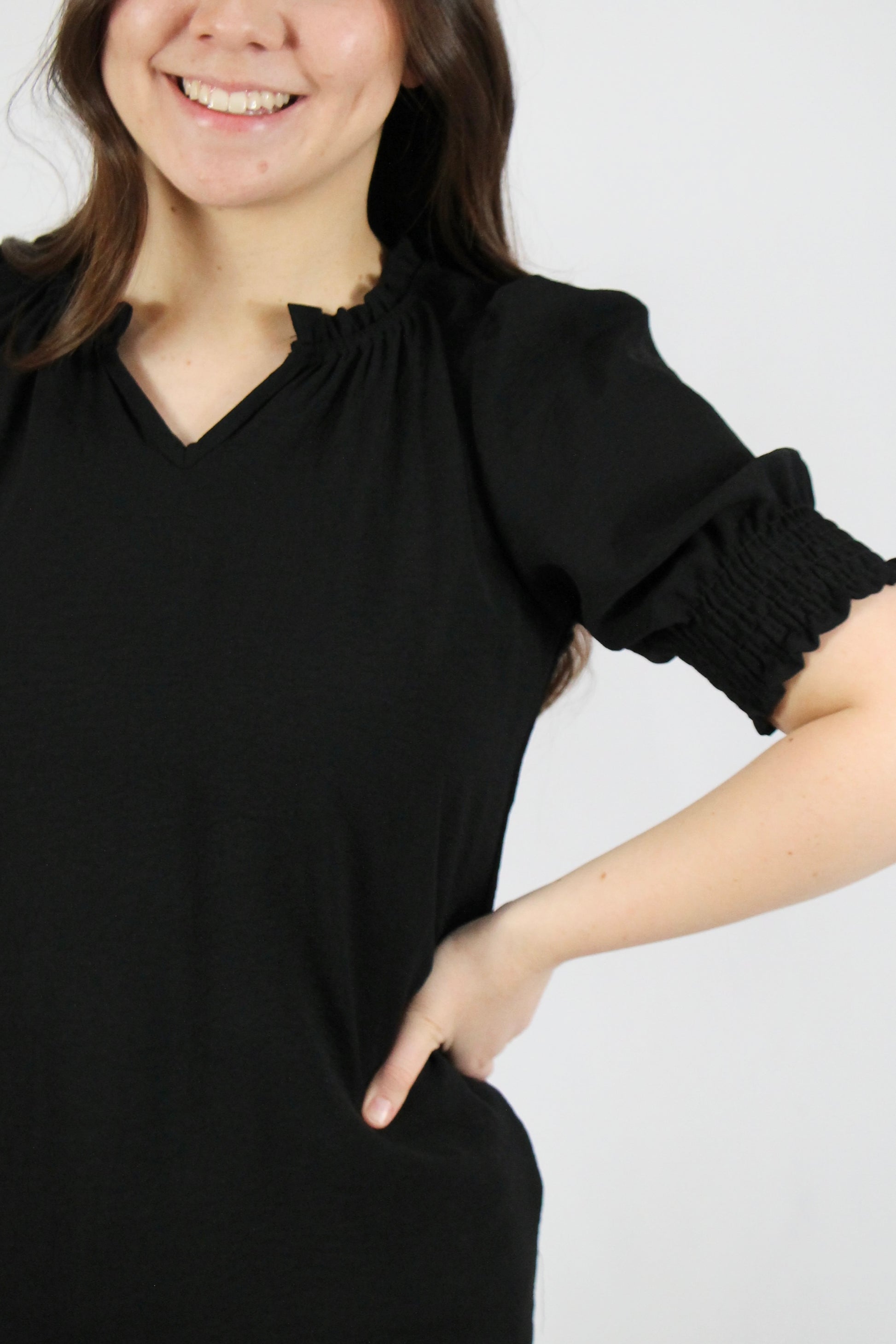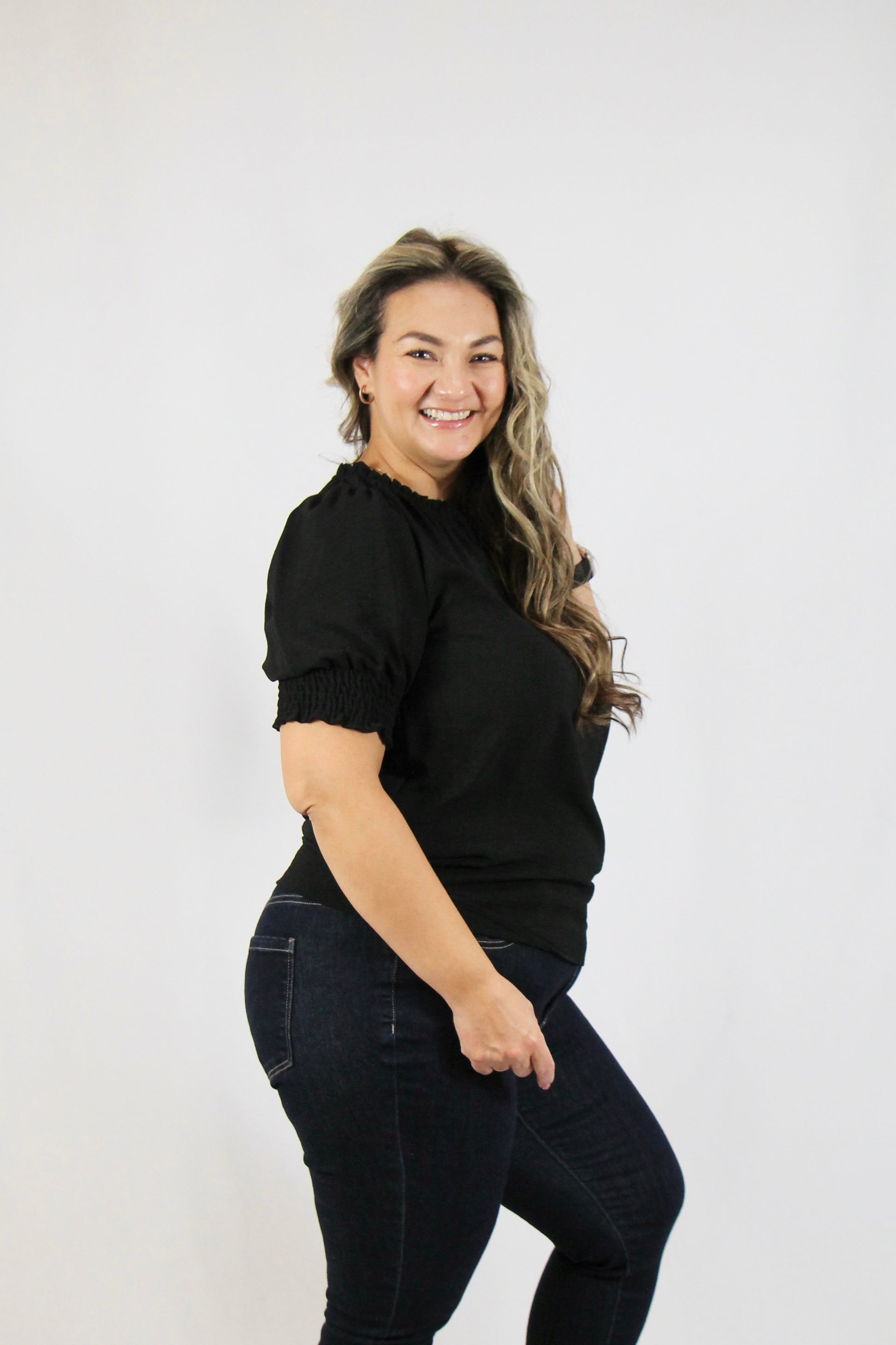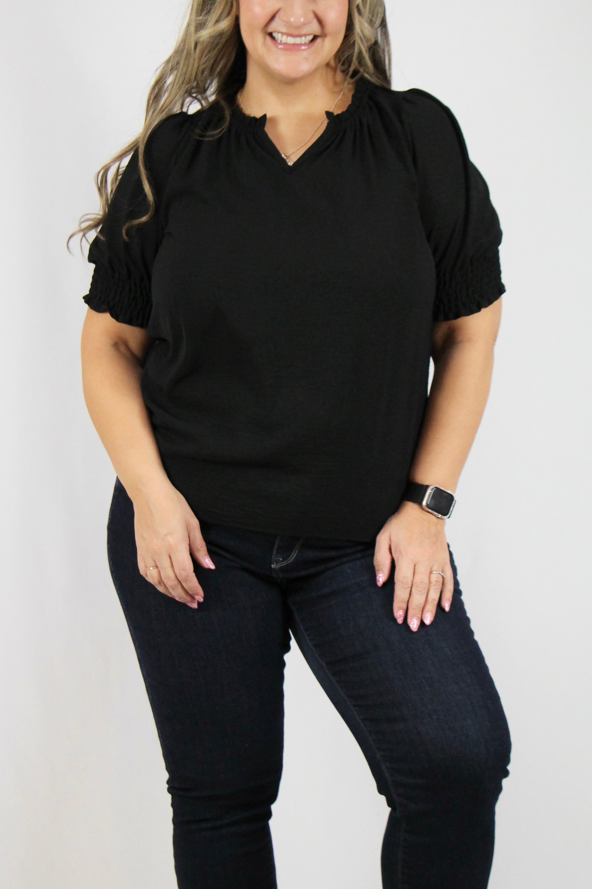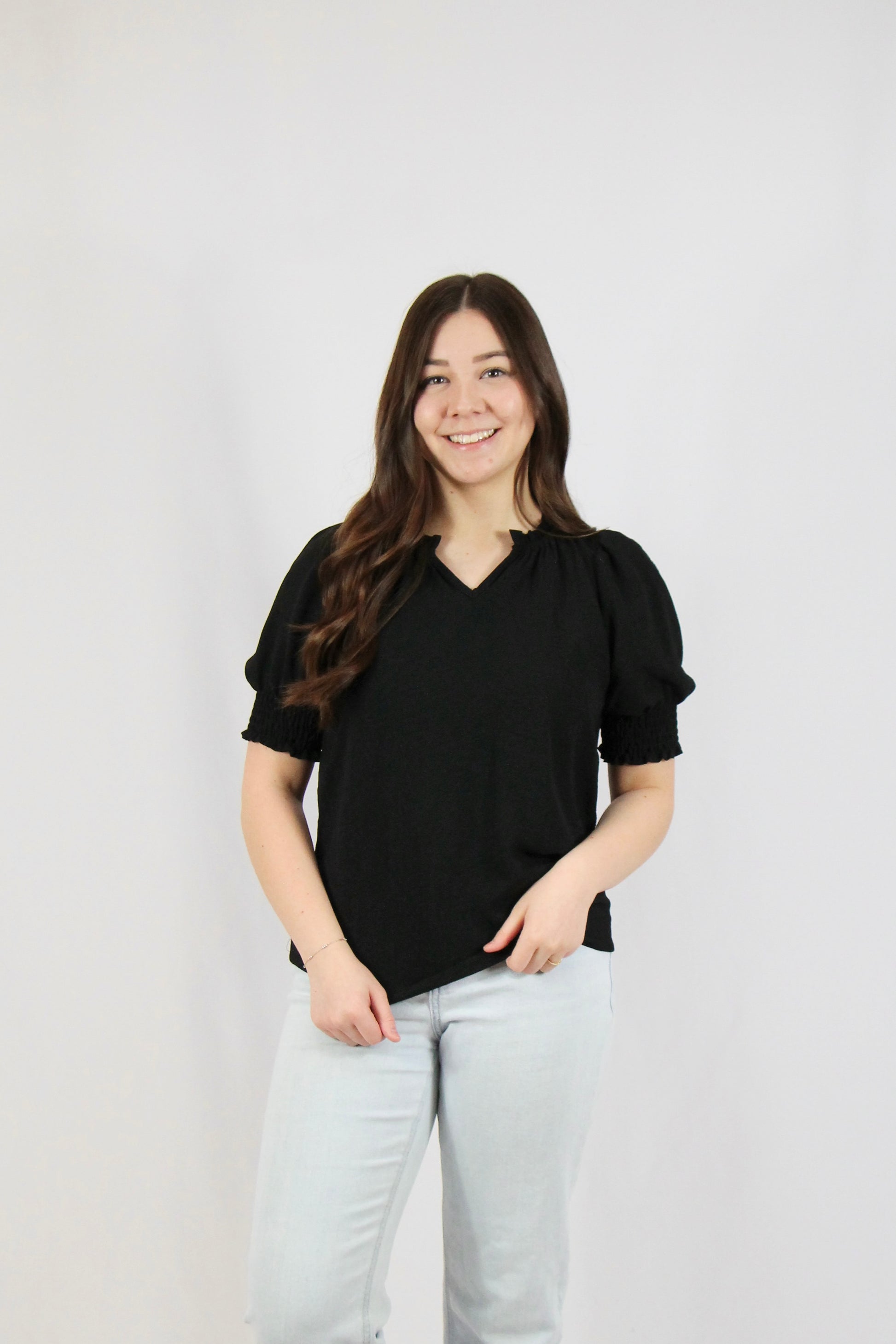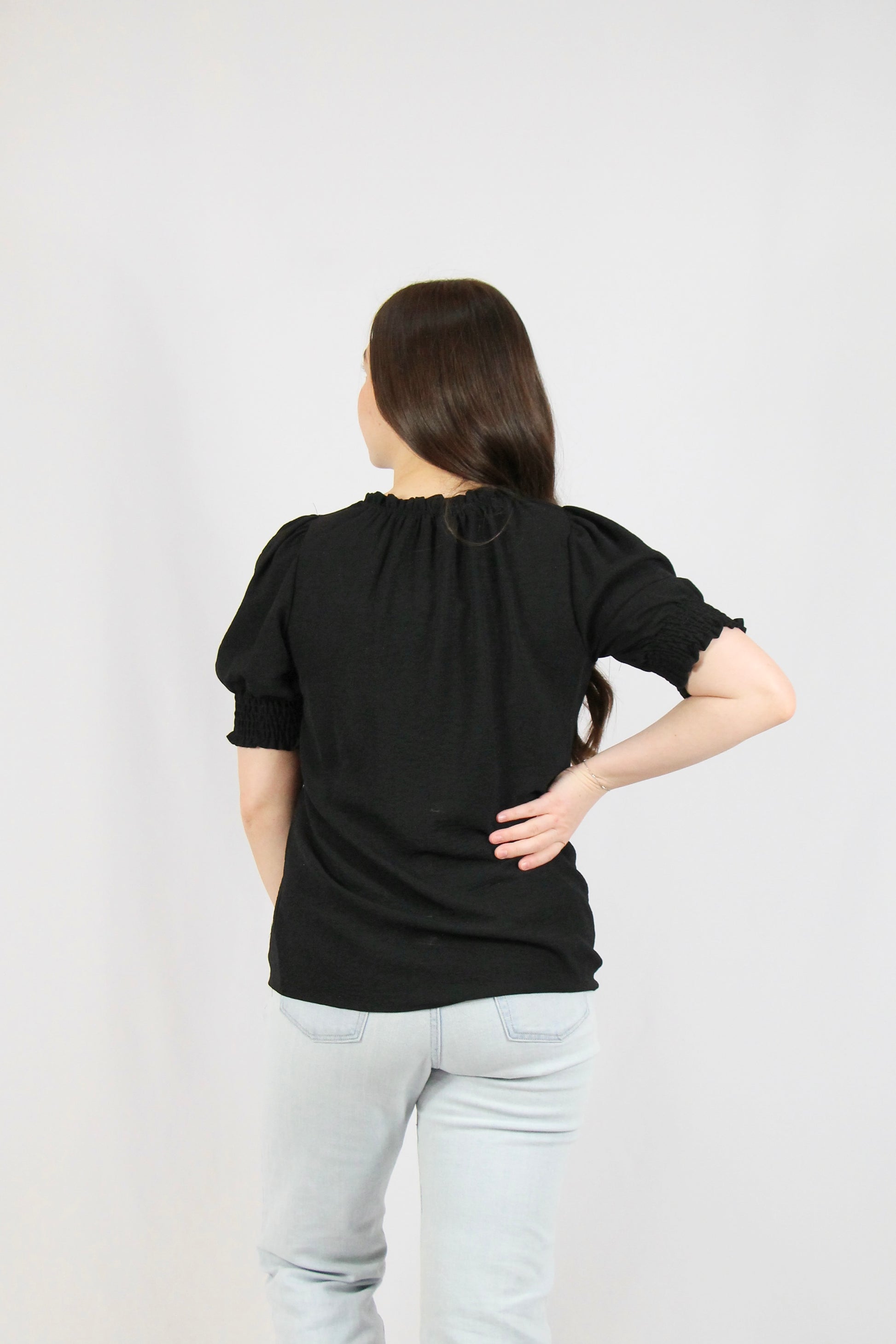 The Carol Top is your go-to piece for effortless versatility. This classic black blouse features a flattering notched V-neck with charming ruffle detailing that adds just the right amount of visual interest. Short puff sleeves bring a contemporary touch while maintaining timeless appeal. Whether you're dressing it up for the office with tailored trousers or keeping it casual with your favorite jeans, the Carol Top transitions seamlessly through your week.
