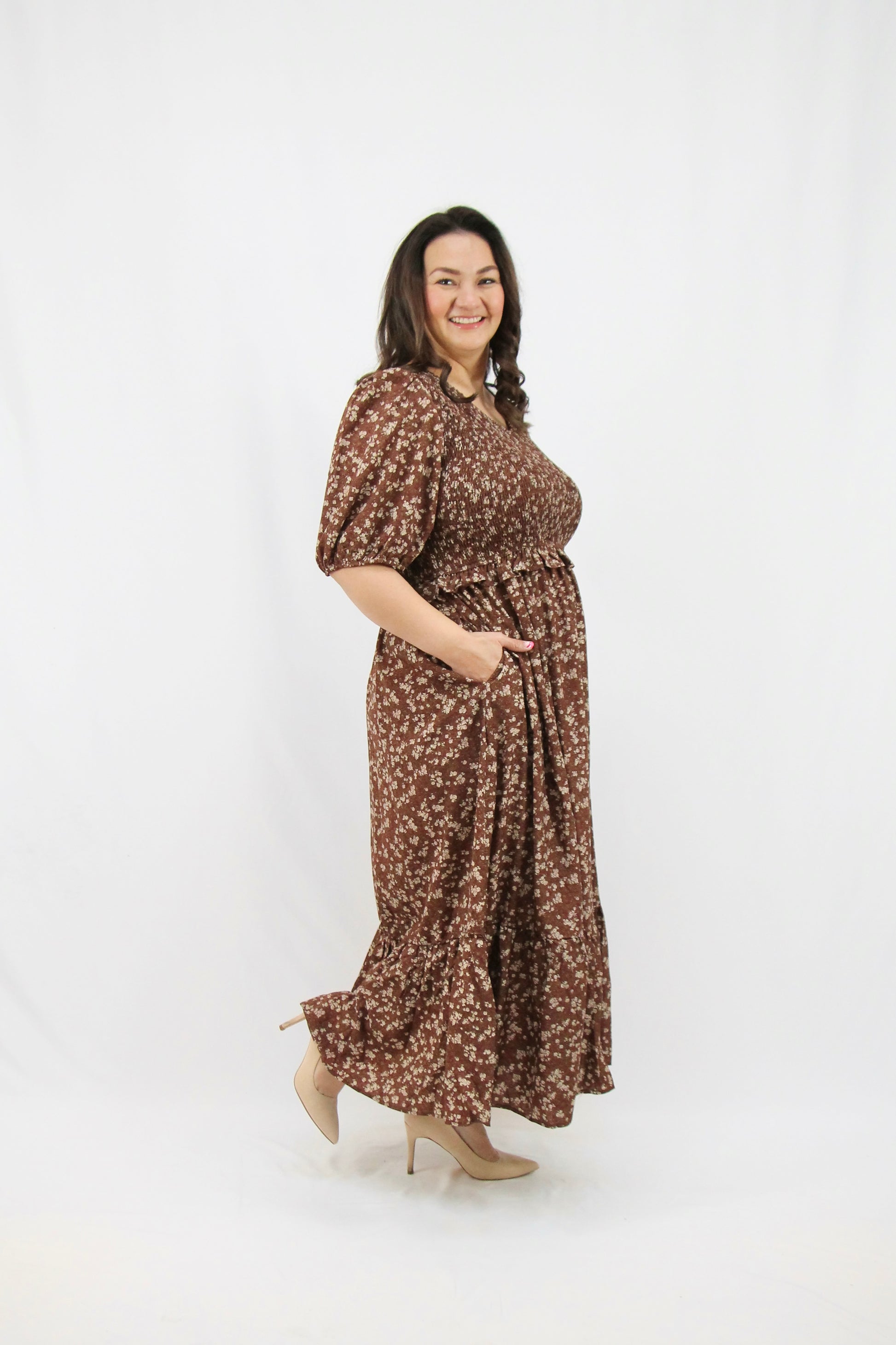 The Elena Dress combines timeless elegance with practical comfort. This brown midi dress features a flattering V-neckline and delicate smocking at the bodice for a refined silhouette. Short puff sleeves add a touch of feminine charm, while the single-tiered skirt with ruffled waist detail creates movement and visual interest. Functional side pockets offer everyday convenience.