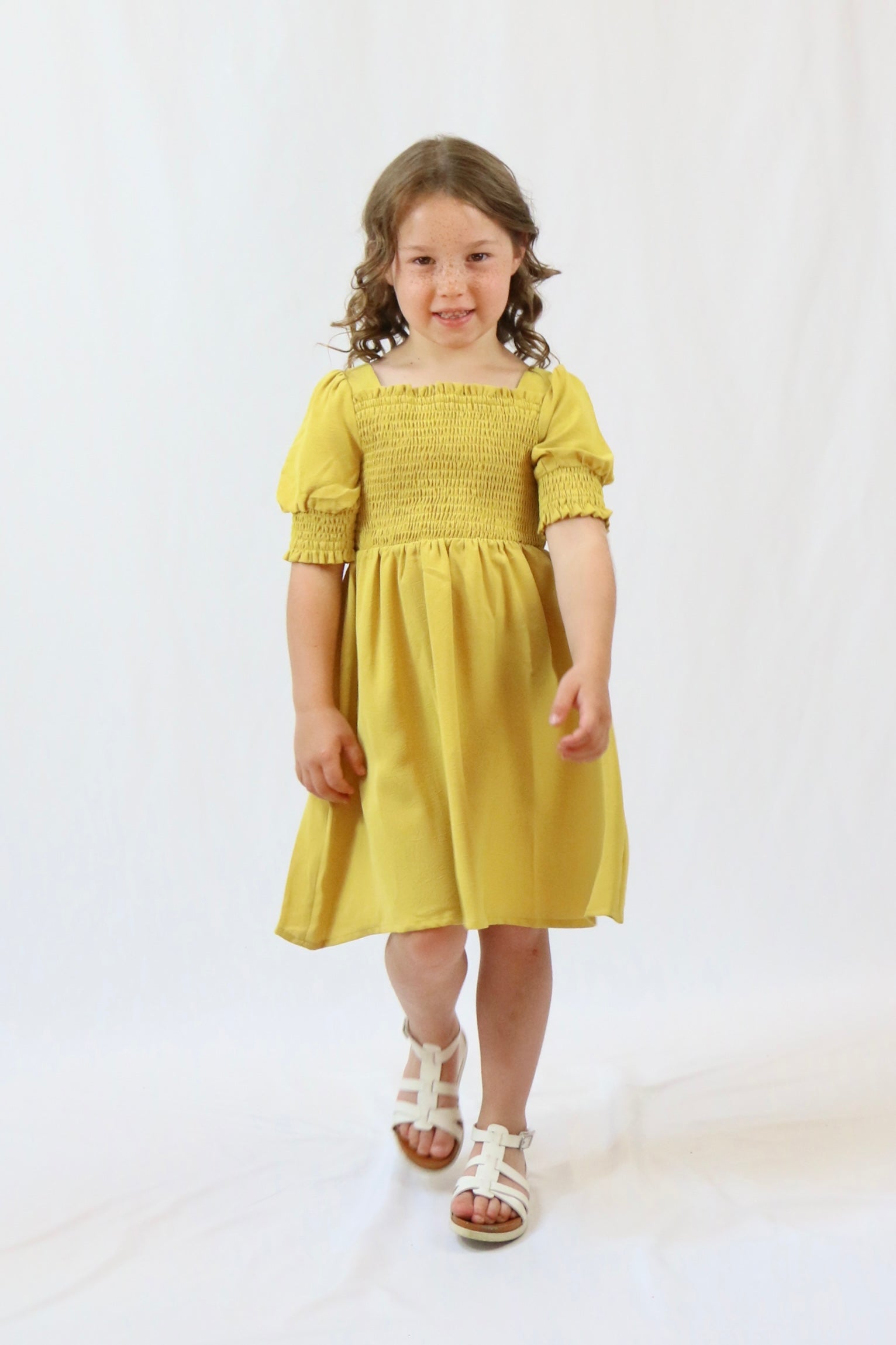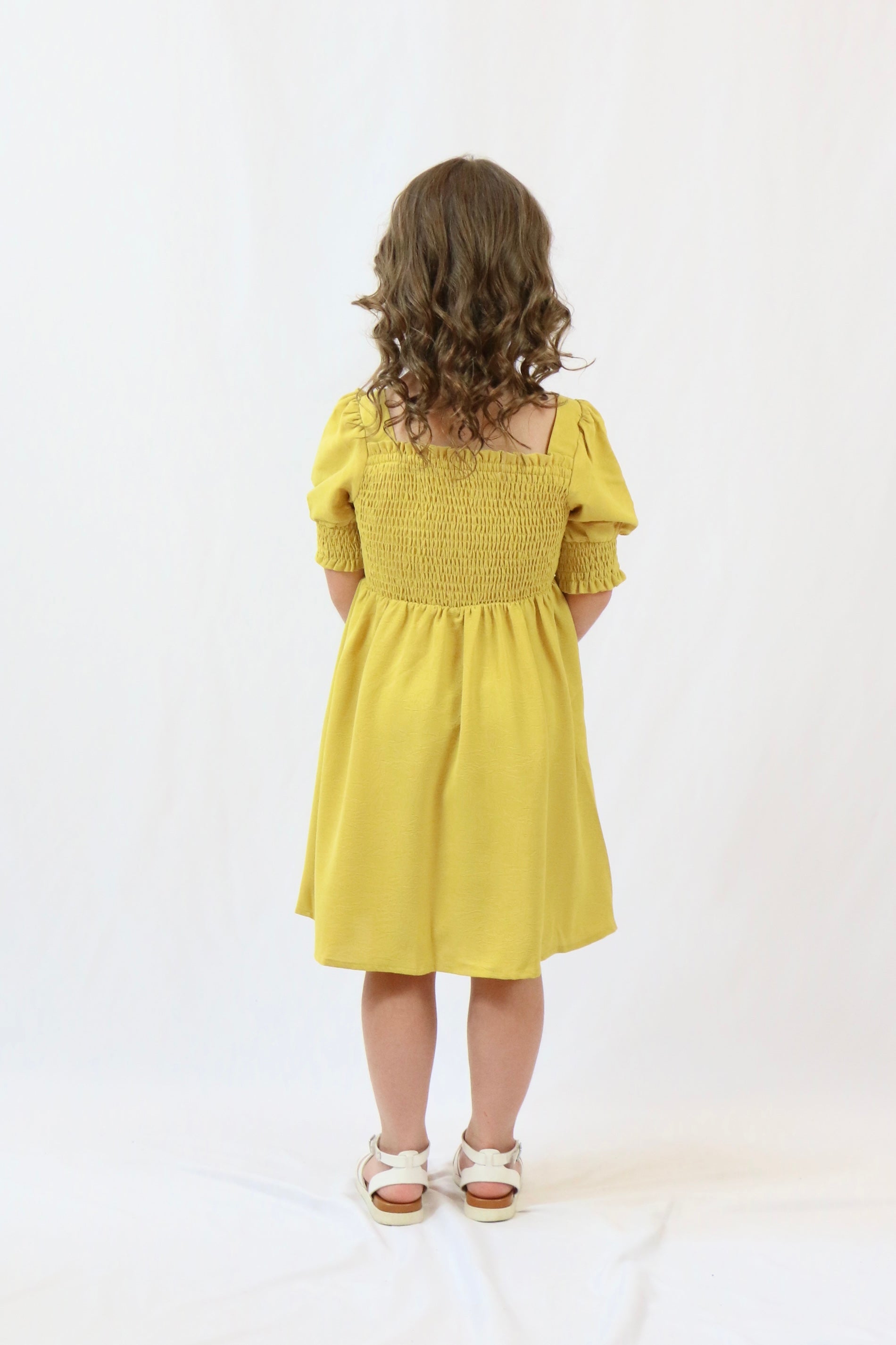 This charming yellow dress features a smocked bodice and short sleeves, perfectly framed by a square neckline. Designed for comfort and style, it’s ideal for playful days and special occasions alike. Bright and cheerful, it adds a delightful touch to any little girl’s wardrobe.