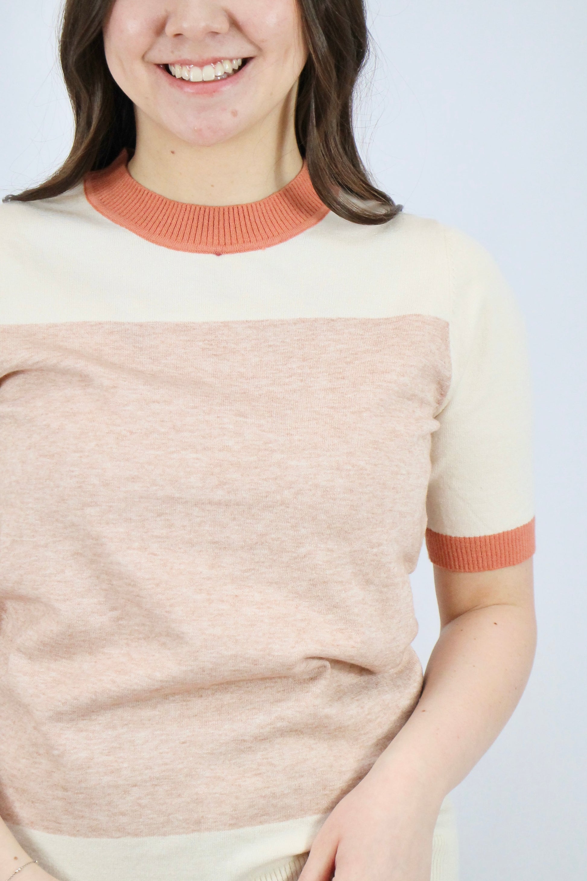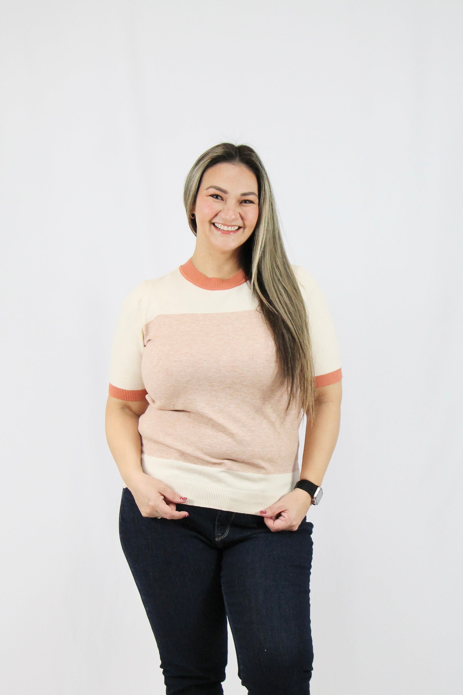 The Ella Top is your go-to piece for effortless style. This lightweight knit features a fun colorblock design that pairs perfectly with everything in your closet. The short sleeves keep things breezy and comfortable, making it ideal for layering or wearing solo. Whether you're running errands or meeting friends, this casual essential brings a pop of personality to your everyday rotation.