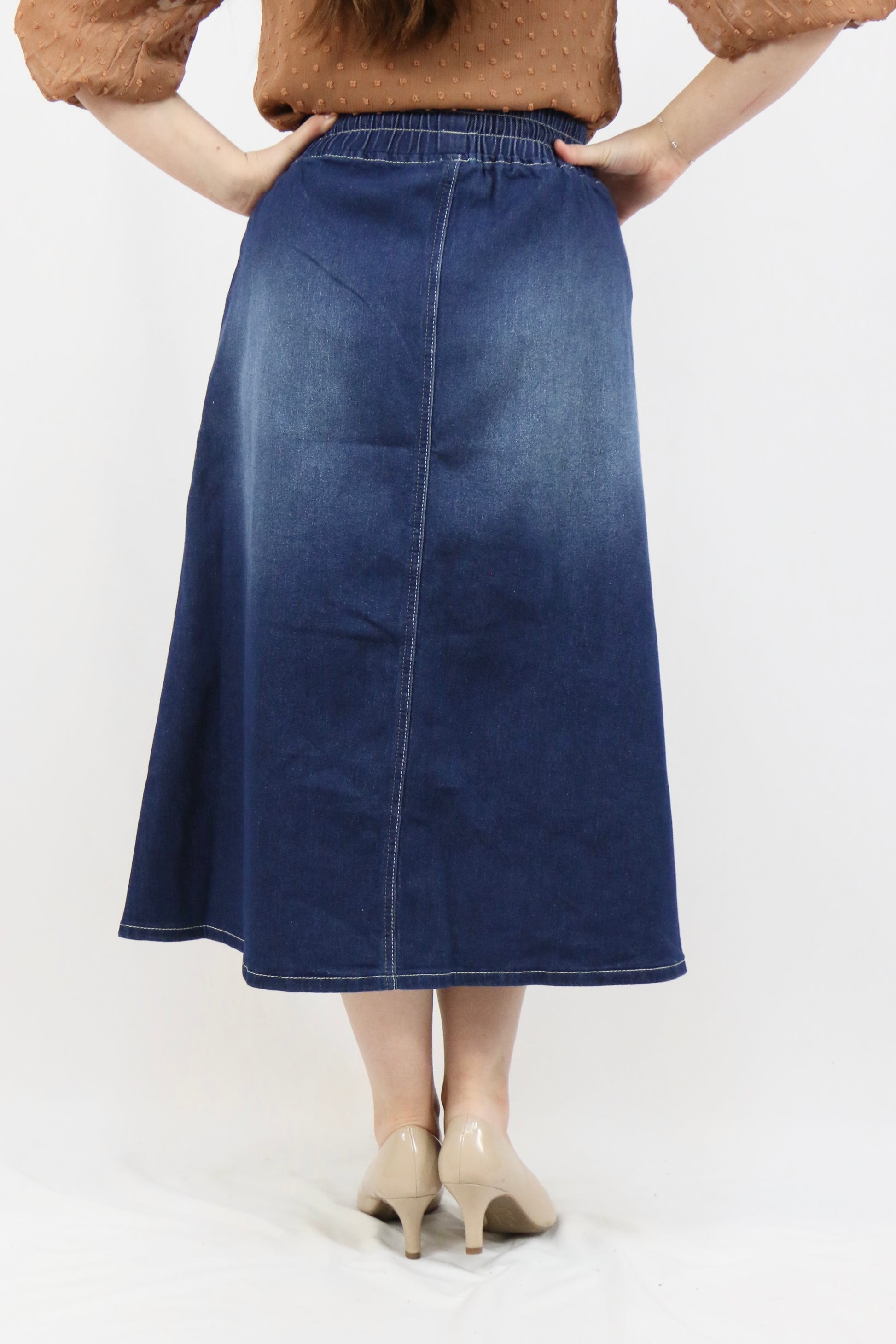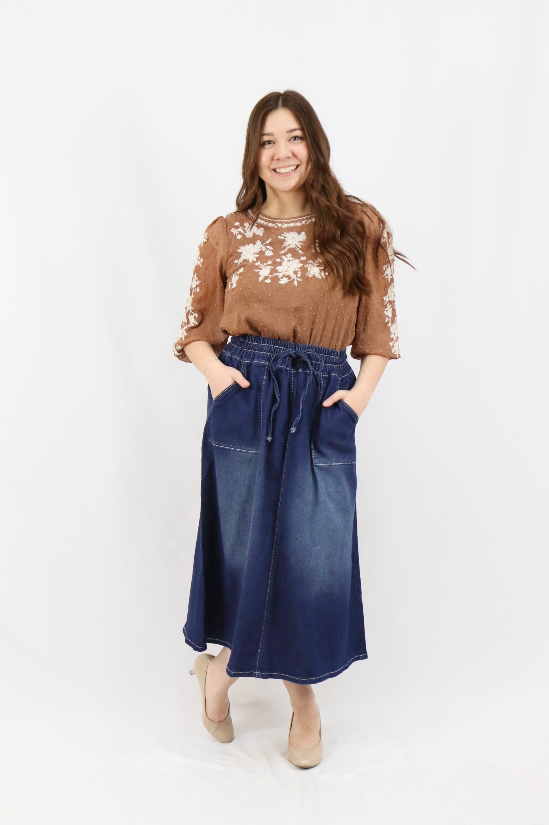 Meet the Harley Skirt—your new favorite go-to for effortless style and comfort. This playful A-line denim skirt features a stretchy elastic waist with a functional drawstring, letting you adjust the fit just right. Its flattering midi length makes it perfect for everything from casual days out to spontaneous adventures.