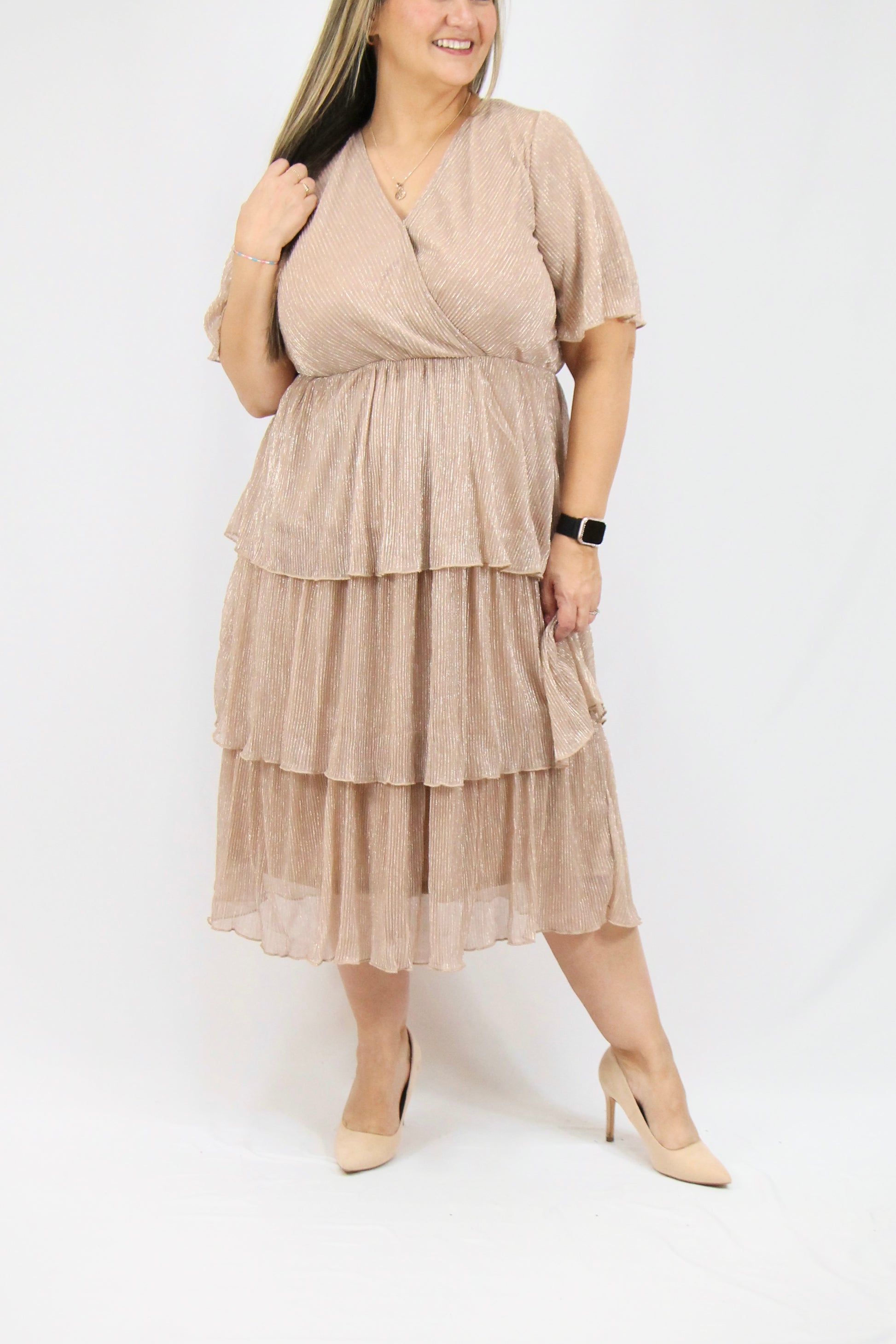 The Isabella Dress captures effortless elegance in a luxurious champagne hue with subtle shimmer throughout. Featuring a flattering crossover bodice and delicate ribbed detailing, this piece flows beautifully with voluminous sleeves that frame the shoulders. The long tiers skirt creates graceful movement and dimension, making it perfect for special occasions or elevated everyday wear. A timeless silhouette that exudes refined sophistication.