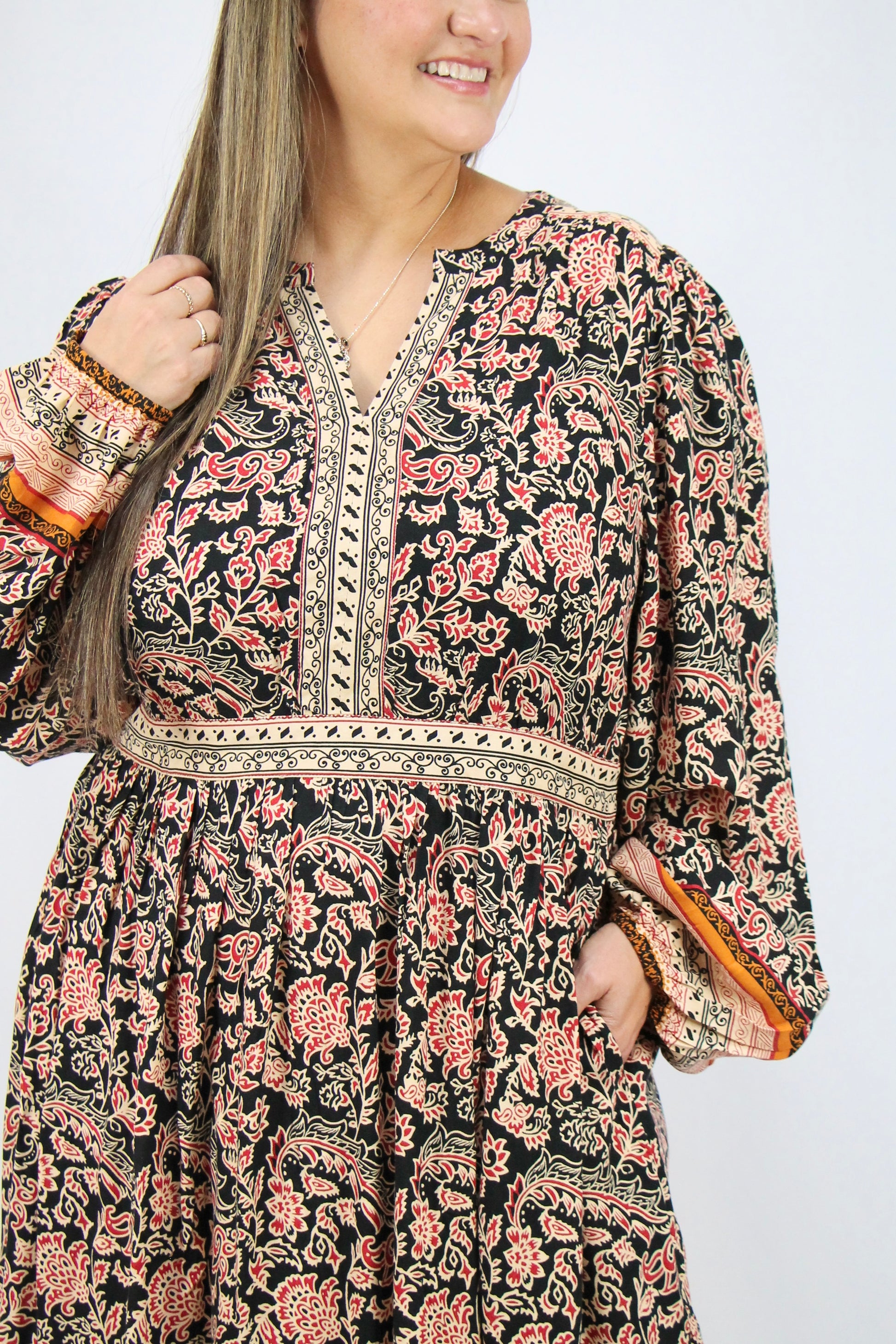 The Matilda Dress effortlessly blends boho charm with modern style, featuring bold contrasting patterns that make a striking impression. Its slightly fitted bodice flatters your silhouette, while the long sleeves add an elegant touch. Designed for practicality and comfort, it includes a convenient side zipper and side pockets. Embrace unique style and functionality with this standout piece.