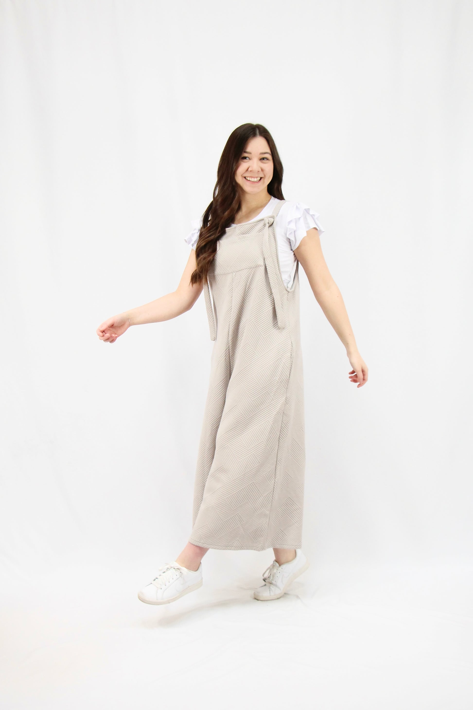 The Milo Jumpsuit is your new go-to for any occasion. This loose-fit wonder features a textured fabric that adds visual interest, wide legs for maximum movement, and adjustable tie shoulder straps so you can customize your fit. Practical side pockets keep your essentials close, while the low scoop back adds a flirty touch of sophistication. Whether you're heading to brunch or a casual night out, this jumpsuit does all the work for you.
