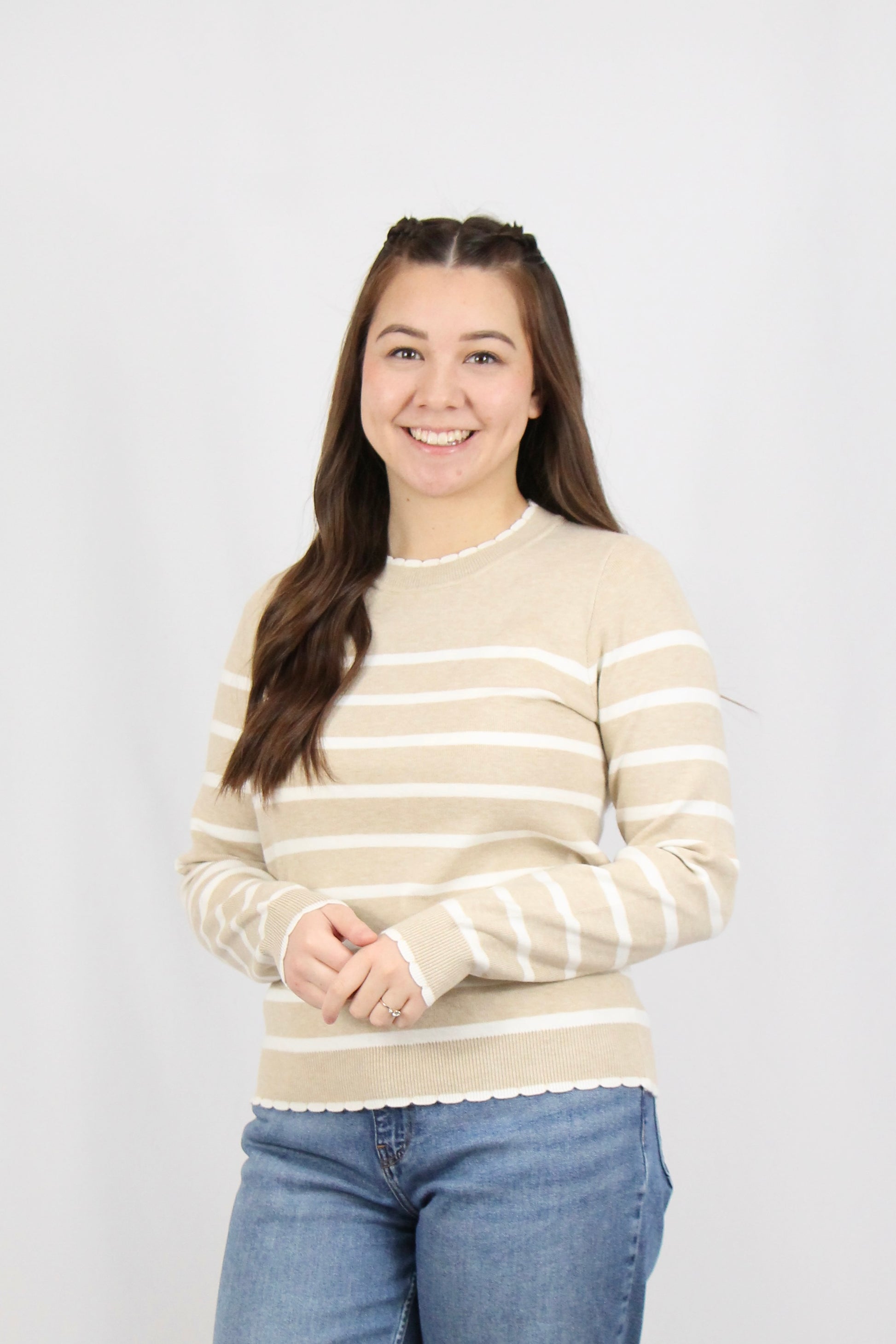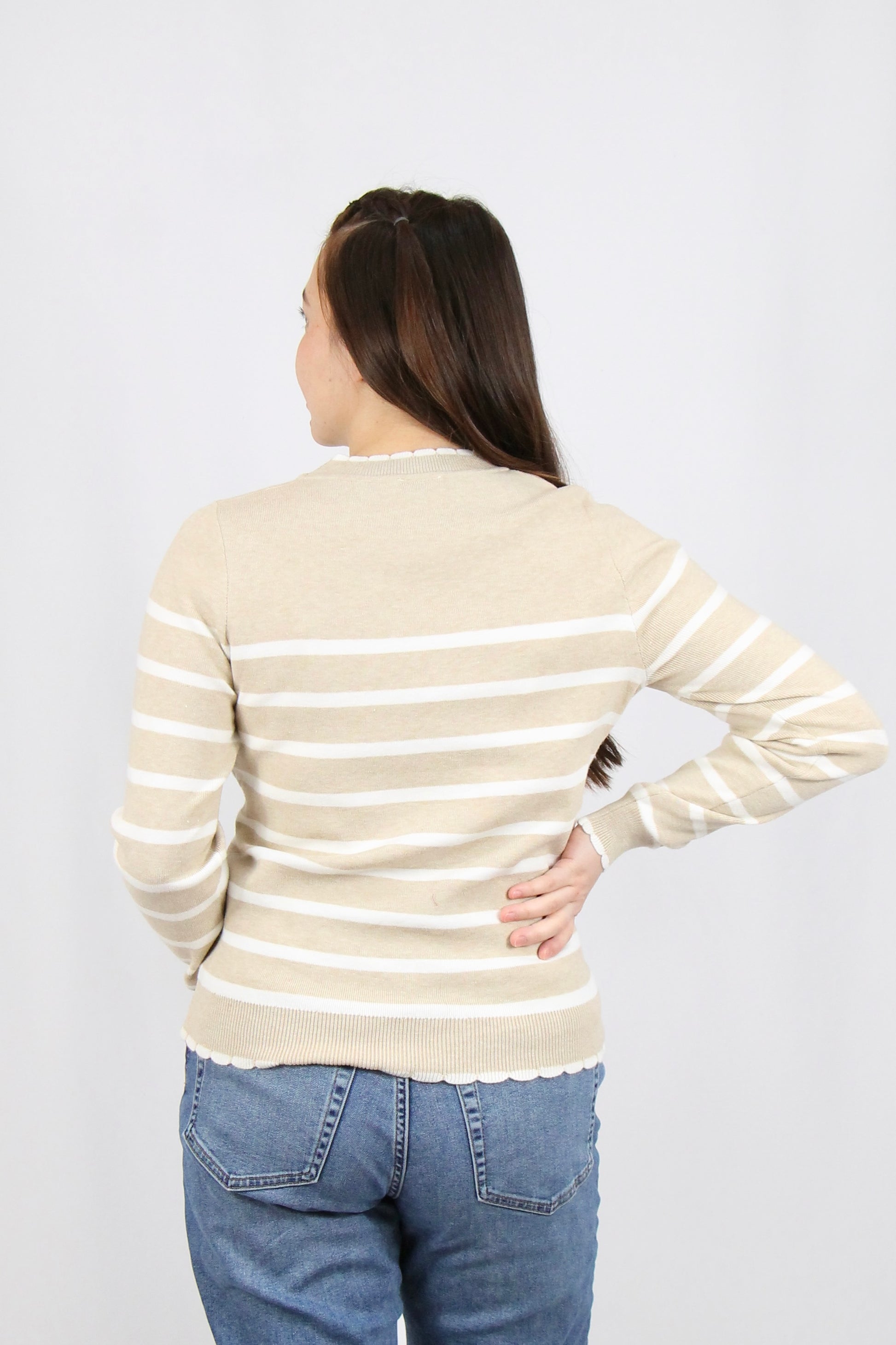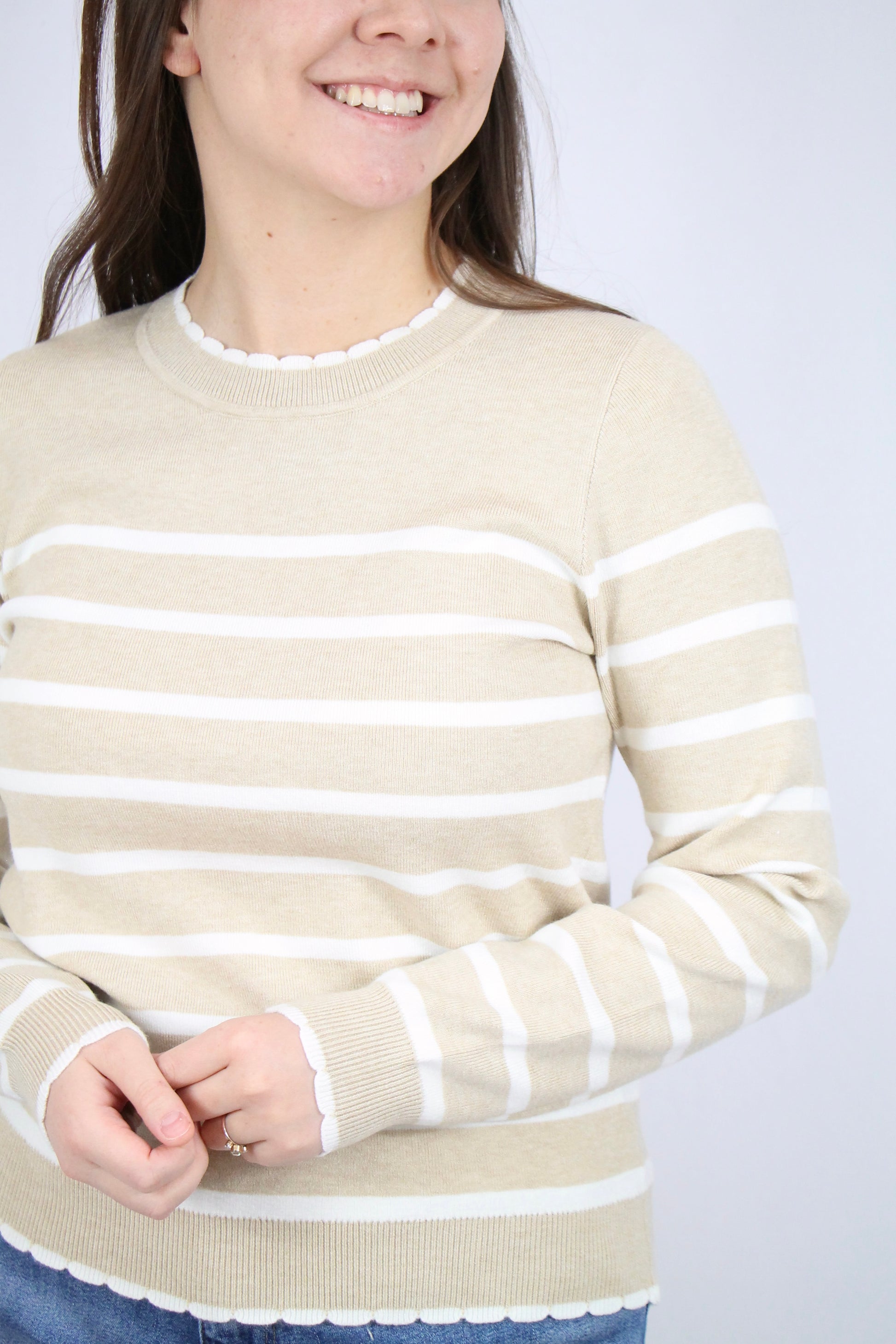 The Myra Top combines a lightweight knit fabric with elegant scallop detailing and timeless tan and white stripes. Its relaxed fit offers comfortable wear while adding a touch of effortless style to any outfit. Perfect for casual days or layering, this top brings both comfort and chic simplicity to your wardrobe.