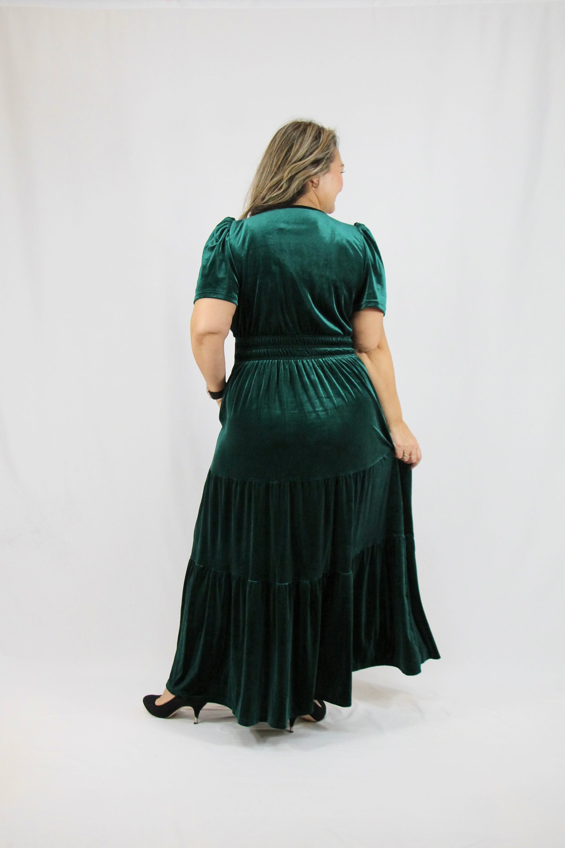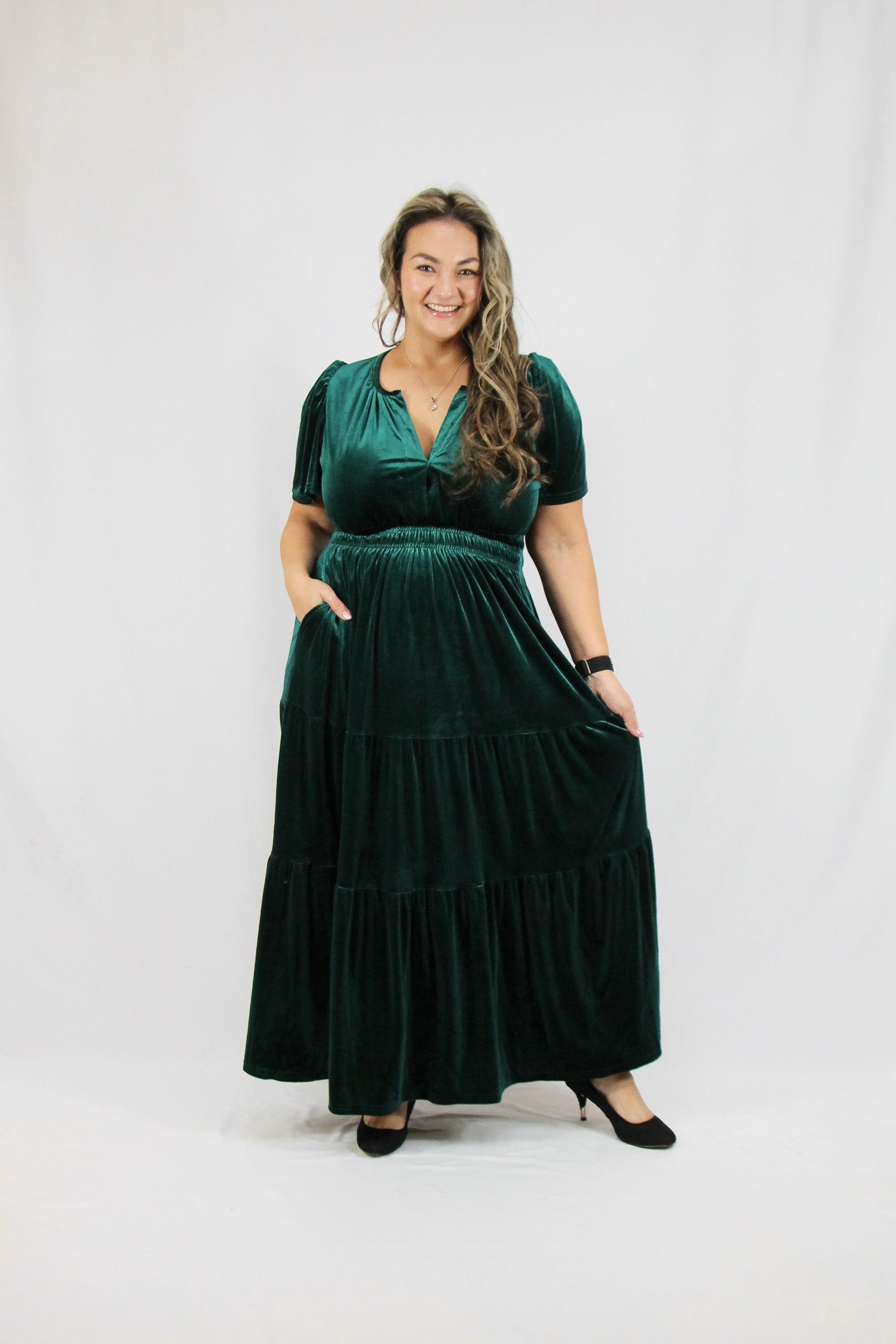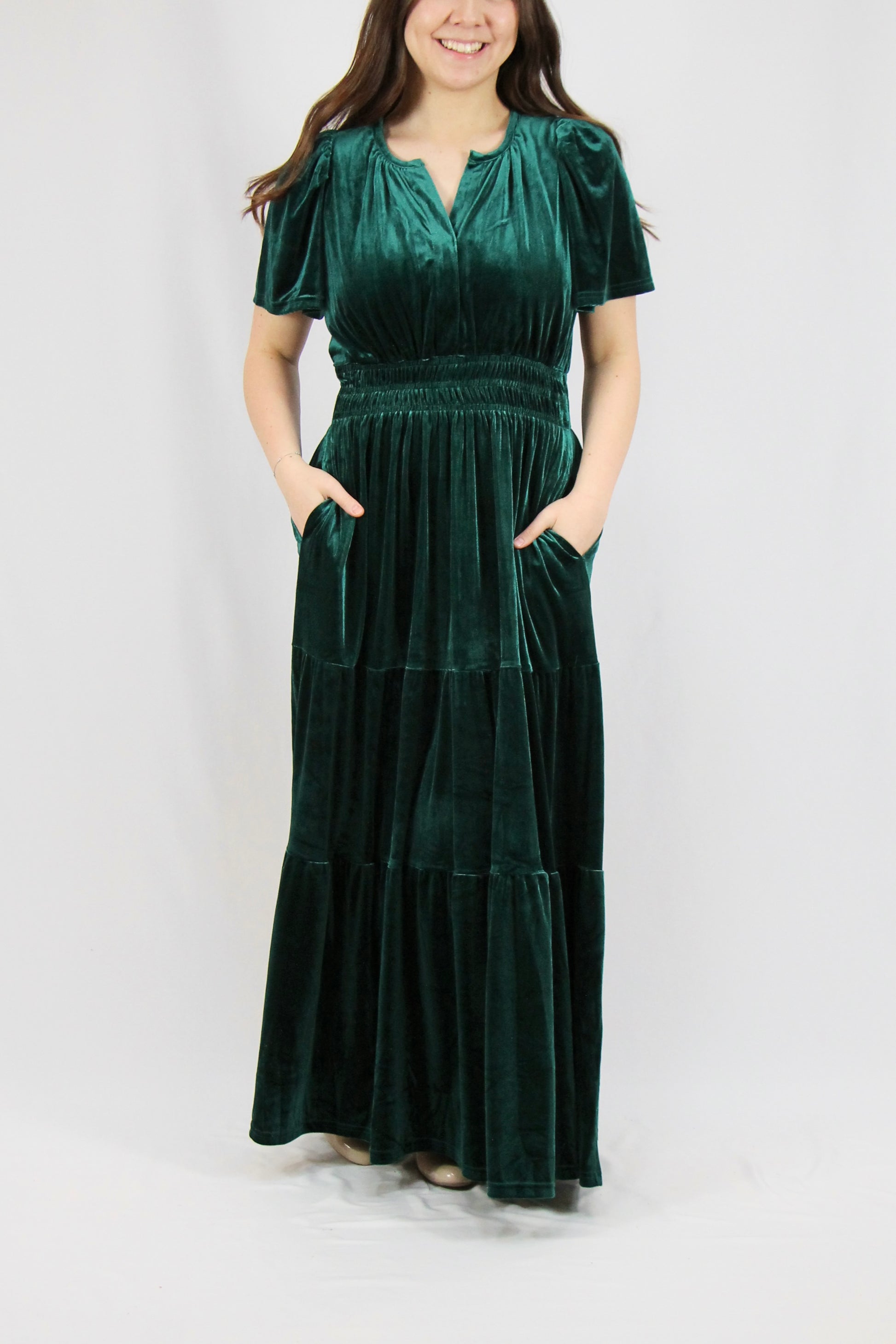 Introducing the Noelle Dress, crafted from luxurious black velvet. This maxi dress features a notch v-neck, short sleeves, and a wide elastic waistband to accentuate your figure. With the added convenience of side pockets, this dress seamlessly combines style and functionality. Elevate any occasion with this timeless and elegant piece.