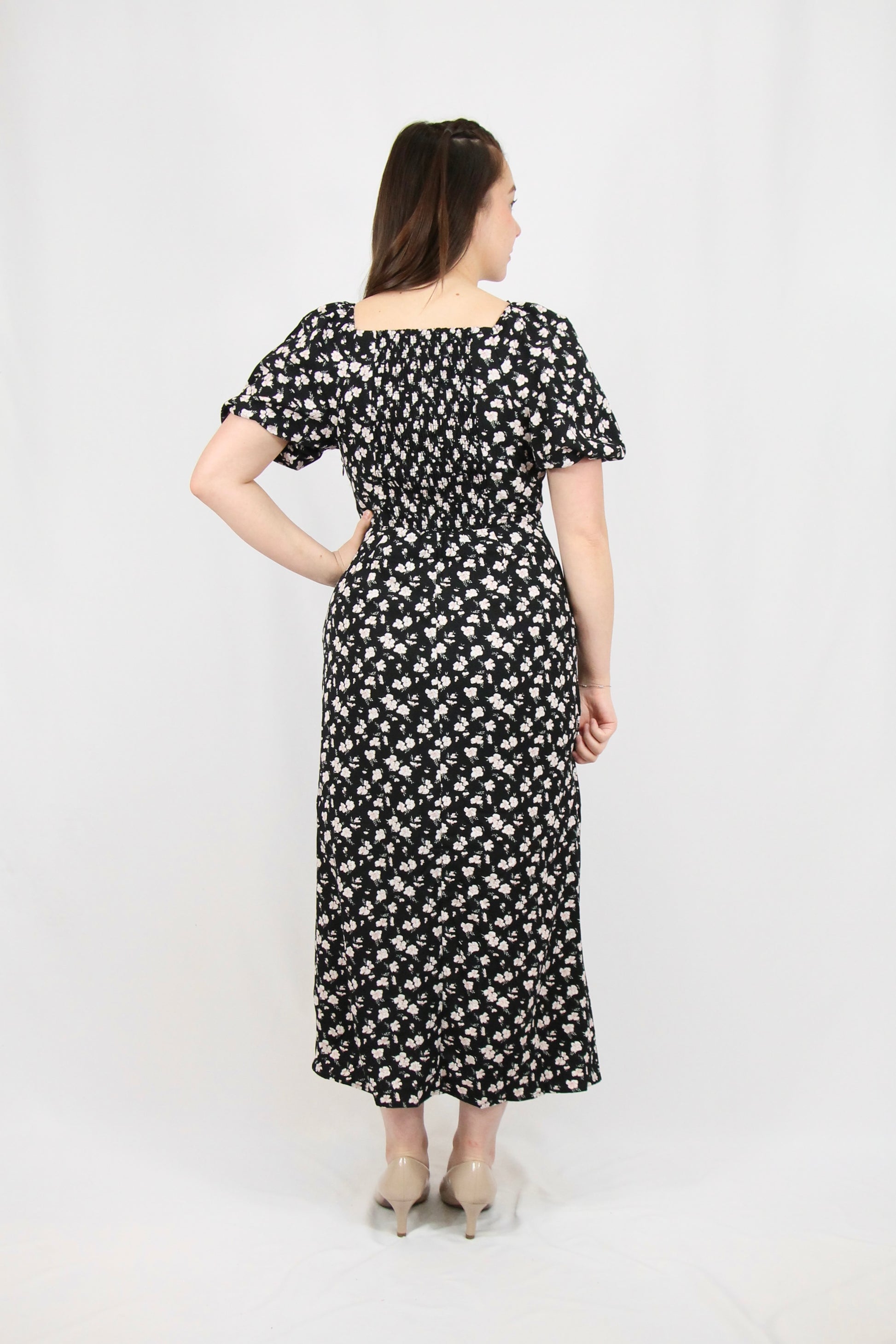The Solene Dress combines elegance with modern flair, featuring a sleek silhouette that flatters every figure. Its square neckline and puff sleeves add a touch of sophistication, while the side ruching and faux wrap detail enhance shape and movement. Perfect for any occasion, this black dress with small floral print offers a confident, polished look that transitions effortlessly from day to night.