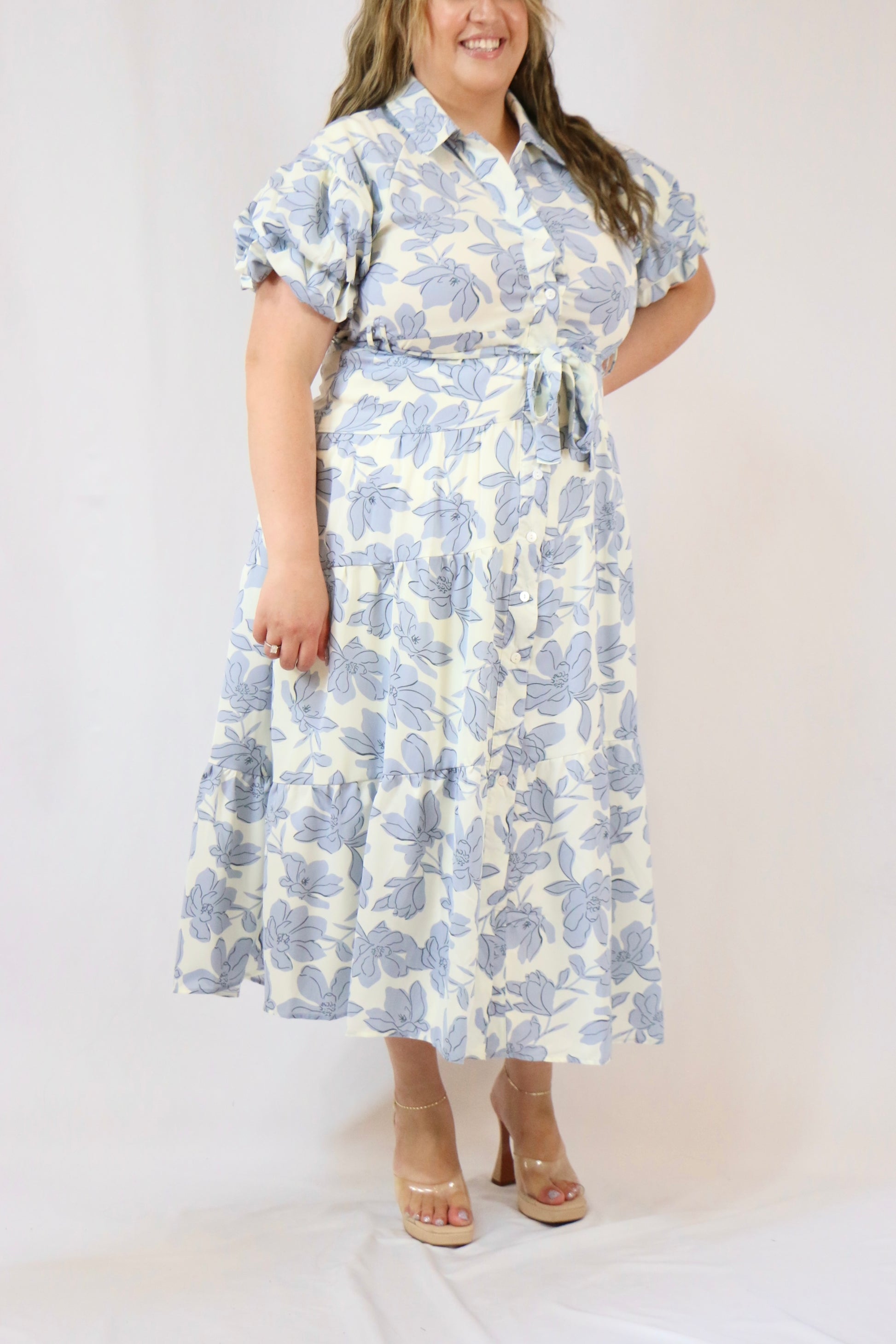 Elevate your wardrobe with the Spencer Dress, a stunning blue and white floral piece designed to turn heads. Its classic collar and functional buttons offer timeless elegance, while the self-tie belt perfectly cinches your waist for a flattering fit. The eye-catching statement sleeves add a unique flair, and the long midi length ensures you look effortlessly beautiful at any event.