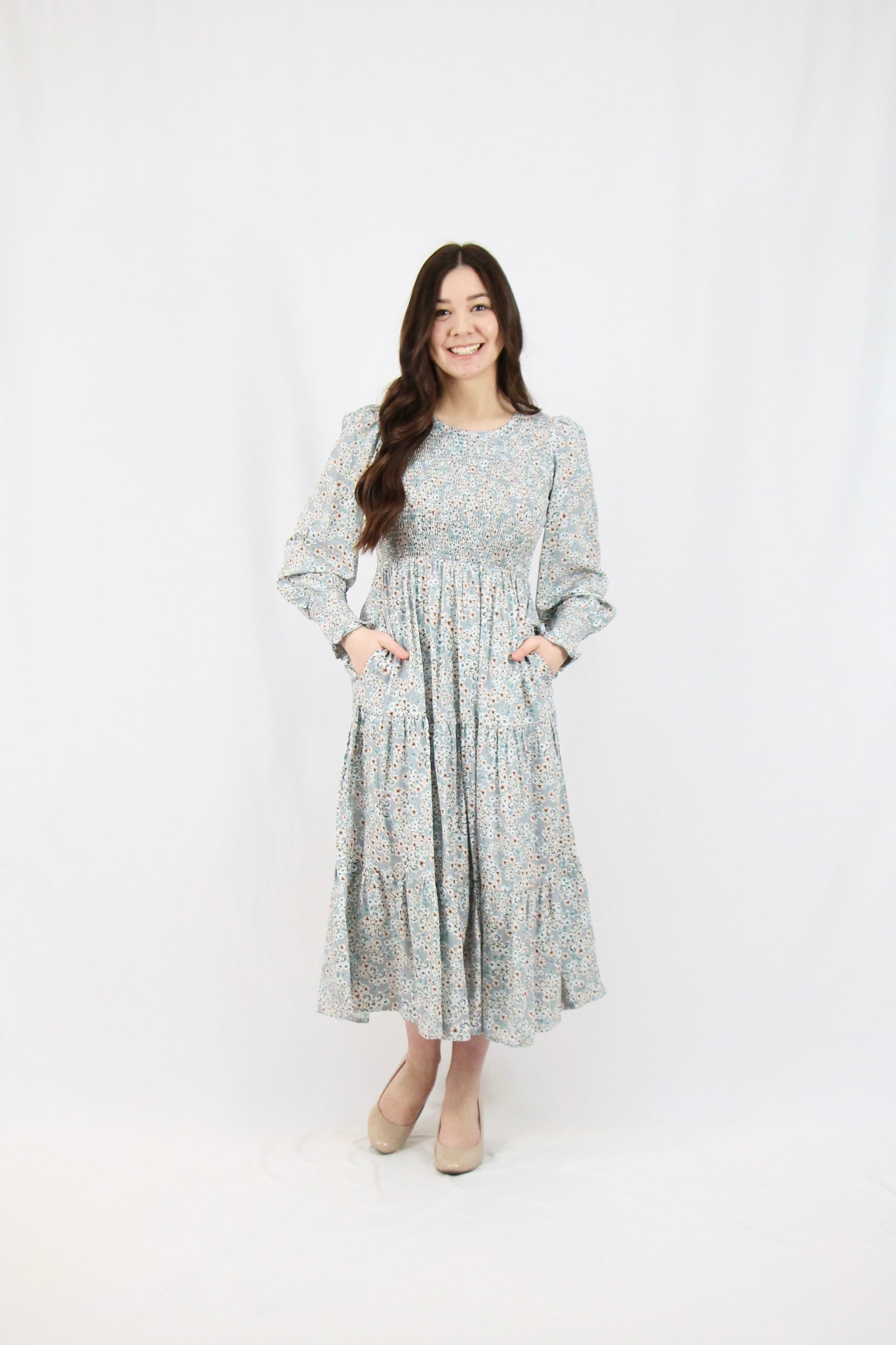 The Tori Dress is your new go-to for effortless charm. This midi beauty features a smocked bodice that cinches beautifully at the waist, paired with cascading tiered layers that twirl with every step. Dressed in a soft light blue with a delicate floral print, it's the perfect blend of romantic and fun. Whether you're heading to brunch, a garden party, or a casual date night, this dress brings instant elegance without trying too hard. Comfortable, flattering, and utterly adorable.